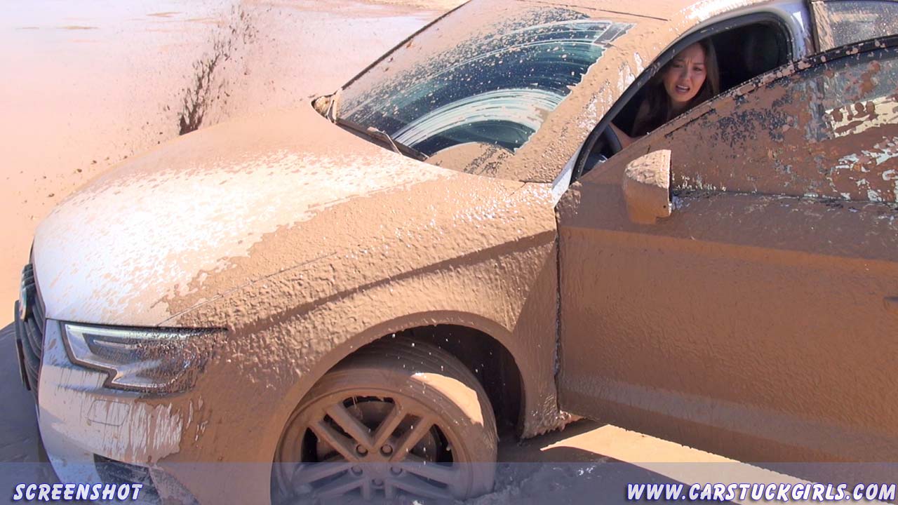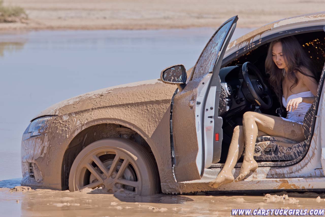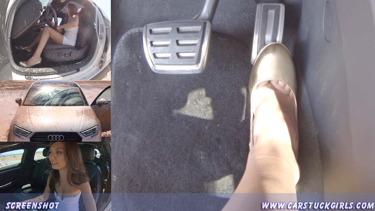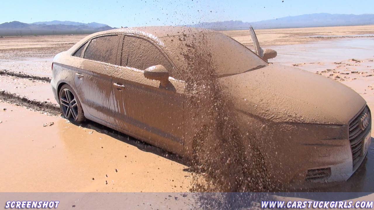 Girl pedal pumping stuck in mud with Audi