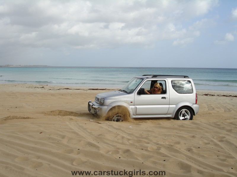 is stuck at the lake bed. She is trying to push her car out