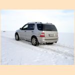 Adriana is driving in the snowy countryside and following her